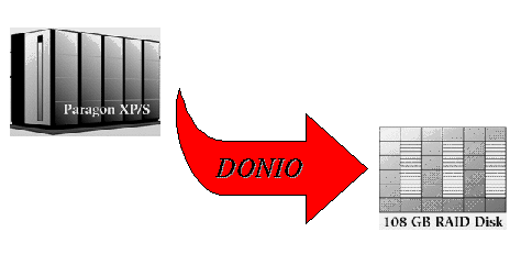 Approach: DONIO offers a UNIX-like interface consisting of the `C' callable primitives do_open, do_read, do_write, do_lseek, do_lsize, do_flush and do_close, which are similar to the corresponding UNIX and NX routines. DONIO uses the simple idea of caching the entire disk file into the aggregate memory on the multiprocessor. do_read and do_write access the cached copy in memory instead of the disk file. Actual disk operations in DONIO are performed only during do_open for read-only and read-write files, and do_close for read-write and write-only files. DONIO operates on large blocks of contiguous data to take full advantage of RAID 0 striping across multiple disks.